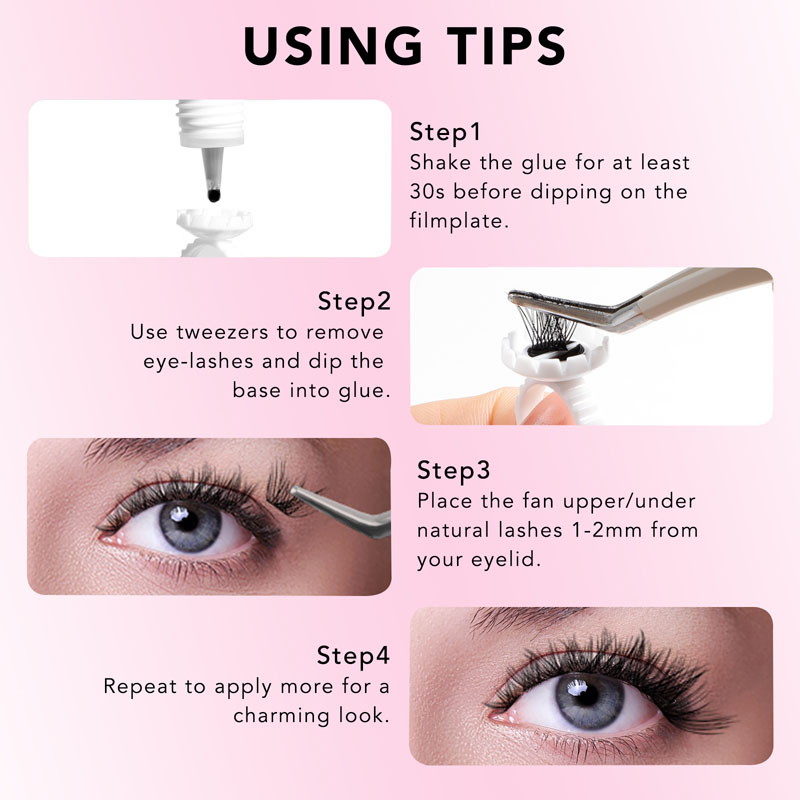 A jelentkezési folyamat gyors és egyszerű. Kezdje azzal, hogy kiválasztja a kívánt szempilla -klasztereket, és egy lapos felületre helyezze őket. Ezután vigye fel kis mennyiségű DIY LASH klaszter ragasztót az egyes klaszterek alapjára. Hagyja, hogy a DIY szempilla -klaszter ragasztója néhány másodpercig megszáradjon, majd óvatosan nyomja meg a klasztereket a természetes szempillákra.